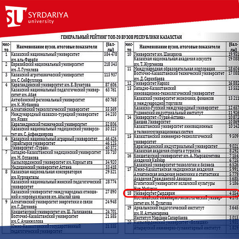 Университет «Сырдария» уверенно вошел в 20-ку лучших вузов Республики Казахстан-2021