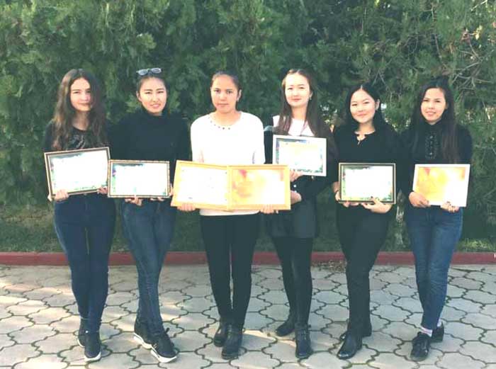 Сертификаты за активное участие были вручены студентам группы Диз-18 Эрсари Алшагуль, студентам группы Диз-15 Уалихану Жансая, преподавателю «Изобразительного искусства и рисования» Келесхан Арайлым, студентам группы Изо-18 Оналбеку Асылзату, Кулану Аяулыму.