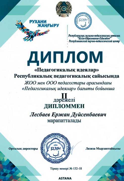 Лесбаев Ержан Дуйсенбаевич, преподаватель кафедры «Программное обеспечение», магистр естественных наук, был награжден дипломом II степени по специальности «Педагогические идеи» среди преподавателей вузов и ООО в республиканском конкурсе «Педагогические идеи», организованном Республиканским научно-педагогическим центром «Білім-Образование-Education».