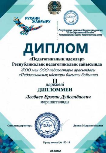 Диплом конкурса от Республиканского научно-педагогического центра "Билим-Образование-Education"