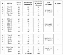 Контингент обучающихся составил 304 студента, из которых полный курс обучения прошли 121 студент (40%).Обучение распределено на 4 потока, 3 потока в 1-м полугодии и 1 поток во 2-м.