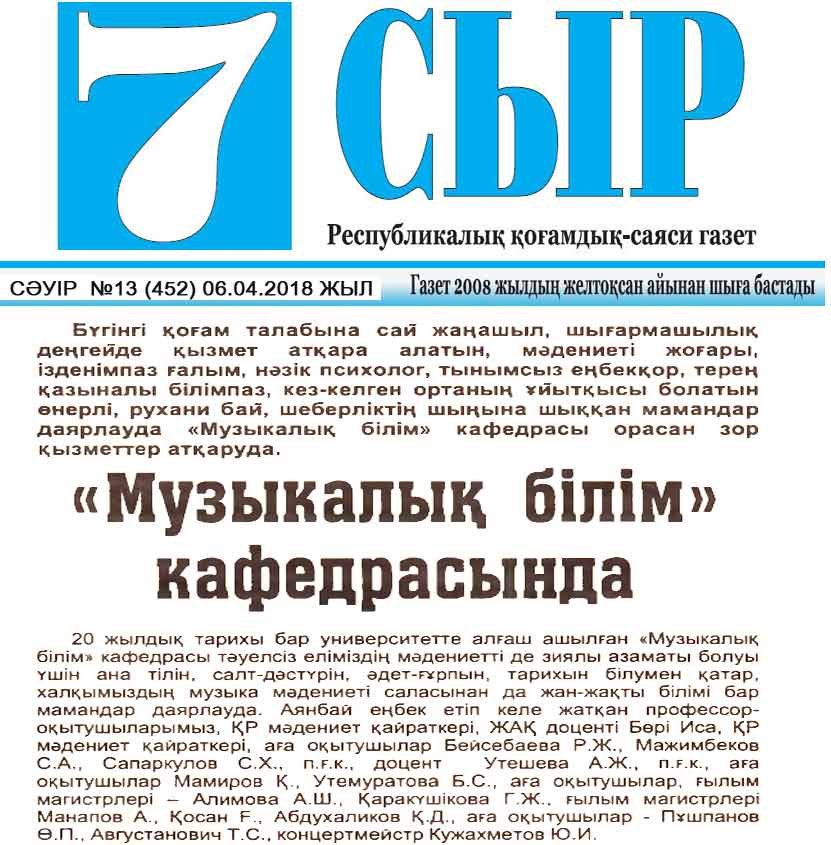 All teachers of the department are engaged in creativity and are laureates of republican, international and regional festivals of various levels. In particular, associate professor Boris Isa is a cultural worker of the Republic of Kazakhstan, Saparkulov S.Kh. - laureate of several republican competitions, associate professor G.Zh. Karakushikova - laureate of the republican festival "Almaly-98", master of natural sciences, teacher.