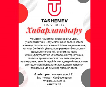 Under the leadership of the Vice-Rector for Social and Educational Work of the University, Zhumabek Akhmetuly Tashenev, together with employees of medical services, the Faculty of Philology and the Faculty of IT, Economics and Law, a training seminar will be organized on the topic “Protecting youth from fraud, drug addiction and gambling, providing they receive psychological support.”