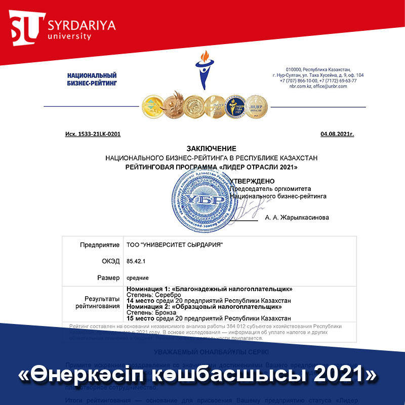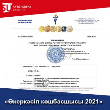 According to the conclusion of the National Business Rating as part of the INDUSTRY LEADER 2021 RATING PROGRAM, Syrdariya University became a silver medalist in the Reliable Taxpayer nomination and a bronze medalist in the Exemplary Taxpayer nomination.