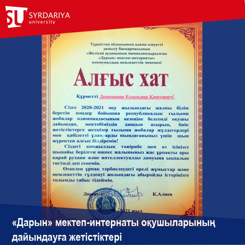 Iskander Kiyatovich Doshmanov, docent of the Department of Natural Science, Candidate of Agricultural Sciences, was awarded a letter of gratitude from the Department of Prospective Development of the specialized state institution "Daryn Boarding School". We hope that your many years of experience and sincere dedication to your work will contribute to the further spiritual and intellectual development of the younger generation. We wish you creative success in the noble cause of educating the younger generation!