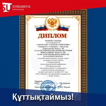 The second degree diploma is awarded to Uldanai Alibekovna Saparbayeva for active participation in the 7th All-Russian Scientific and Practical Conference "Russian Regions as Development Centers in the Modern Sociocultural Space", which took place on October 22, 2021, at the South-Western State University, Kursk , Russia. The article "Historical roots of teaching applied arts in the system of life of the Kazakh people".