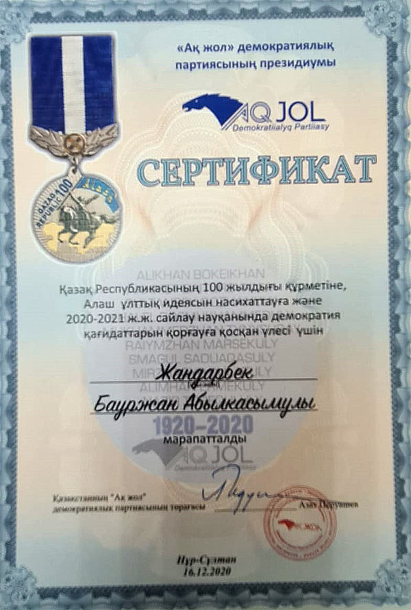 Head of the Department of "Jurisprudence and Economics", Doctor of Law Zhandarbek B.A. he was awarded a gold medal and a certificate for his active participation as an observer in the election campaign of the Parliament of the Republic of Kazakhstan and local maslikhats, which took place earlier this year (January 10), for his contribution to the promotion of the national idea of Alash and protection of democracy.