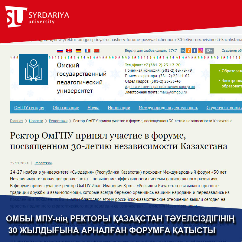 24-27 қарашада Сырдария университетінде (Қазақстан Республикасы) «Тәуелсіздікке 30 жыл: жаңа цифрлық дәуір – ұлттық даму жүйесінің тиімділігін арттыру» халықаралық форумы өтуде. Форумға Омбы мемлекеттік педагогикалық университетінің ректоры Иван Иванович Кротт қатысты. «Ресей мен Қазақстанды біздің халықтарымыз әрқашан мұқият сақтап, ұрпақтан-ұрпаққа жалғасып келе жатқан достық пен өзара көмектің берік дәстүрлері байланыстырады. Соның арқасында бүгінде ресейлік-қазақстандық қарым-қатынастар шынайы стратегиялық серіктестік пен одақтастық деңгейіне жетті», - деді Иван Иванович.