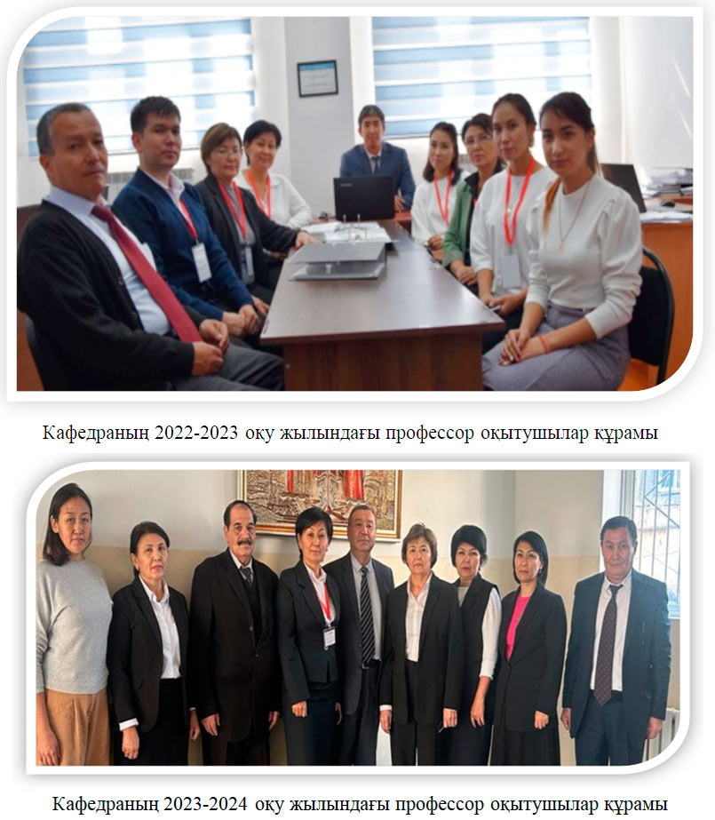 2022-2023 оқу жылында кафедрада 12 профессор оқытушылар құрамы, оның ішінде ғылым кандидаттары - 4, философия докторы РhD-1, ғылым магистр аға оқытушылар-2, ғылым магистр оқытушылар-5 жұмыс жасады.
