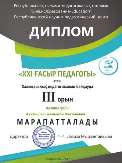 "Білім-Оразование-Education" Республикалық ғылыми-педагогикалық орталығының "ХХІ ғасыр педагогы" атты халықаралық педагогикалық байқауда ІІІ орын