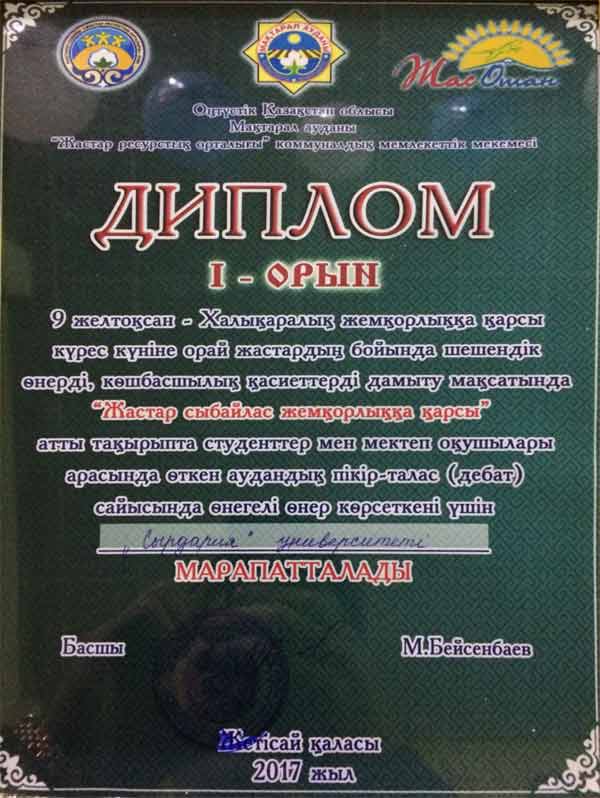 Университет "Сырдария" награжден дипломом I-го места.