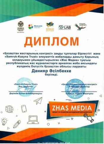 Студент группы КТ-15 Данияр Асильбек стал лауреатом Южно-Казахстанской области и получил диплом в рамках проекта "Молодые СМИ" среди первых республиканских молодых журналистов. Проект организован Ассоциацией юридических лиц "Конгрес молодежи Казахстана" совместно с фондом развития социальных проектов "Samruk-Kazyna Trust".