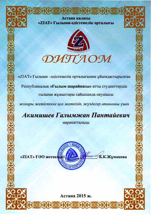 По итогам конкурса старший преподаватель Акимышев Галымжан Пантаевич занял второе место и был награжден дипломом за высокие достижения в конкурсе научных работ студентов «Наука».