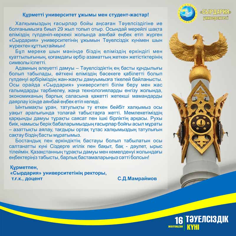 По этому знаменательному событию сердечно поздравляю коллектив университета "Сырдария", который прилагает все усилия для процветания нашей страны, с Днем Независимости!