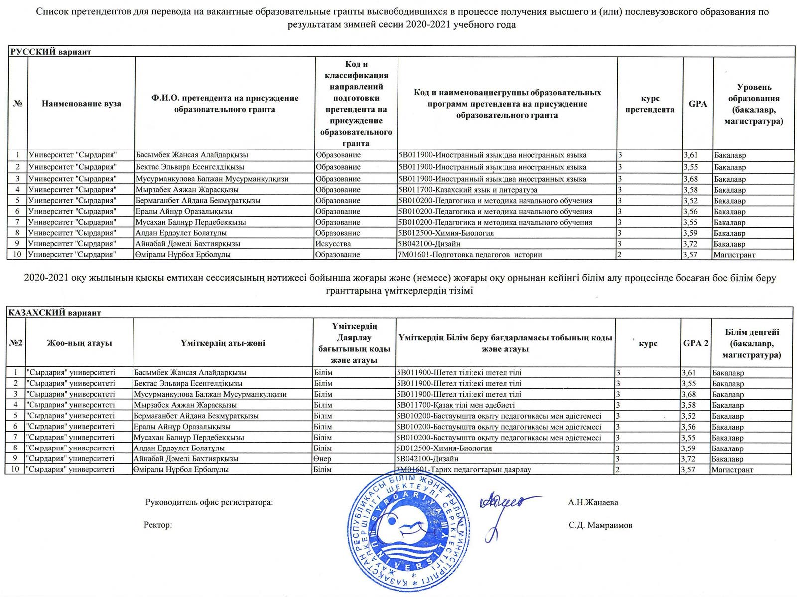 2020-2021 оқу жылының қысқы емтихан сессиясының нәтижесі бойынша жоғары және (немесе) жоғары оқу орнынан кейінгі білім алу процесінде босаған бос білім беру гранттарына үміткерлердің тізімі