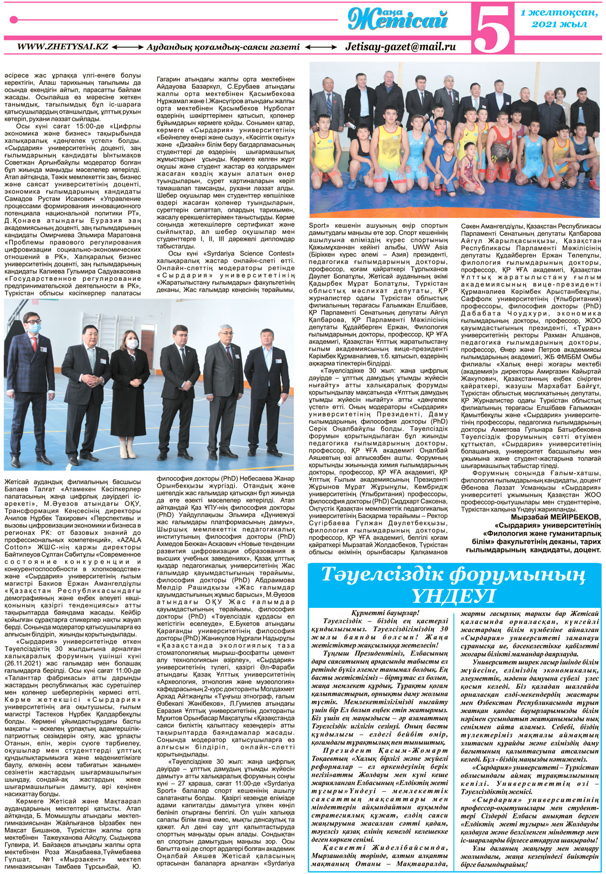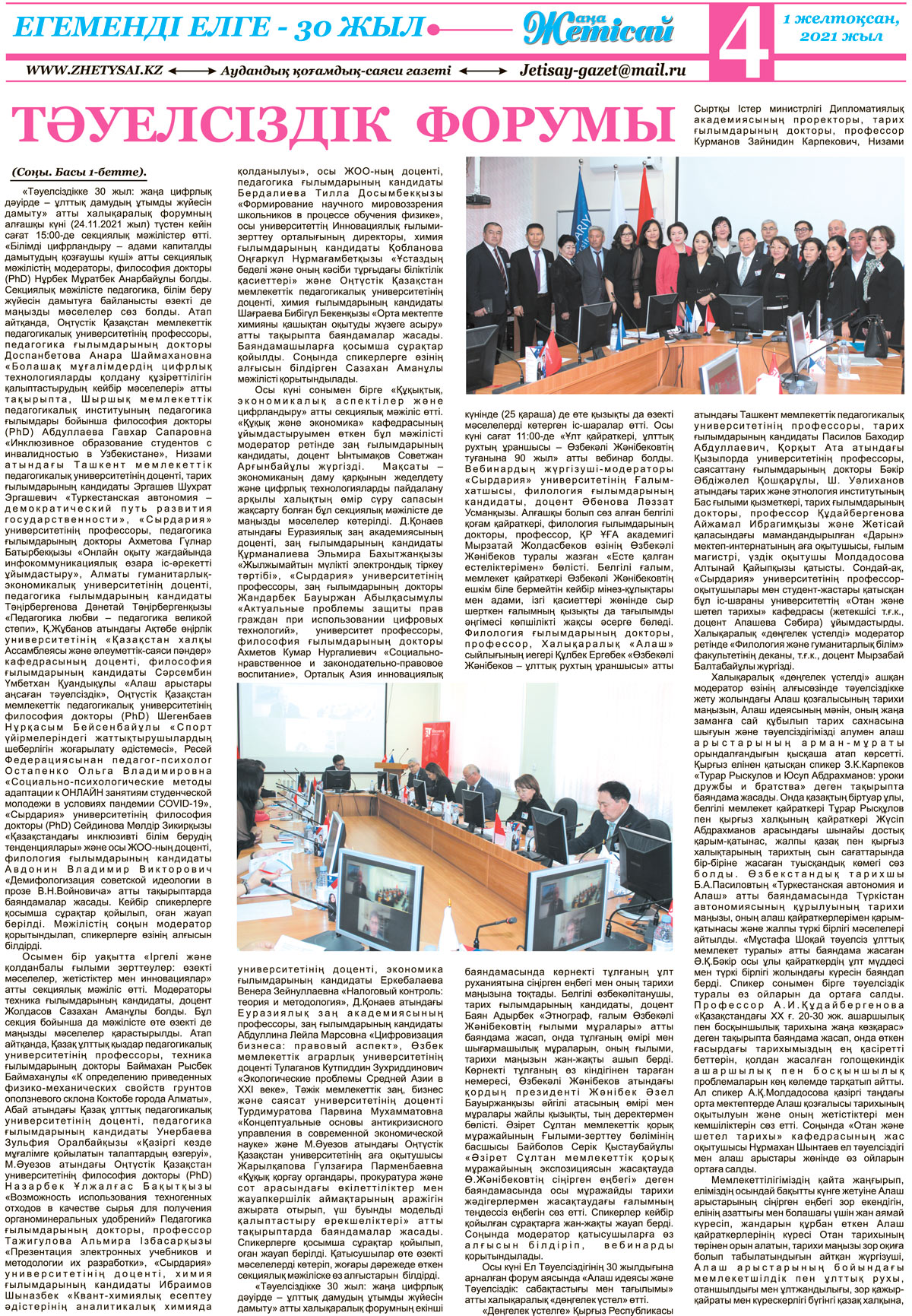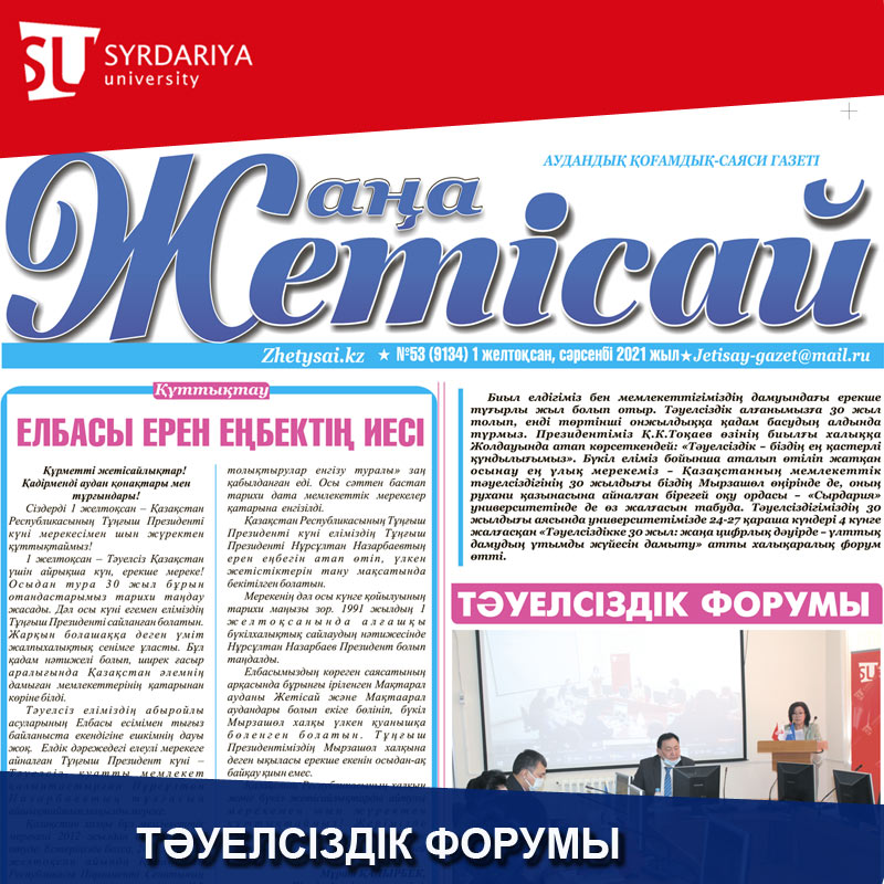 Биыл елдігіміз бен мемлекеттігіміздің дамуындаты ерекше тұғырлы жыл болып отыр. Тәуелсіздік алғанымызға 30 жыл толып, енді төртінші онжылдыққа қадам басудың алдында тұрмыз. Президентіміз Қ.К.Тоқаев өзінің биылғы халыққа Жолдауында aman көрсеткендей: «Тәуелсіздік - біздің ең қастерлі құндылығымыз». Бүкіл еліміз бойынша аталып өтіліп жатқан осынау ең ұлық мерекеміз - Қазақстанның мемлекеттік тәуелсіздігінің 30 жылдығы біздің Мырзашөл өңірінде де, оның рухани қазынасына айналған бірегей оқу ордасы - «Сырдария» университетінде де өз жалғасын табуда. Тәуелсіздігіміздің 30 жылдығы аясында университетімізде 24-27 қараша күндері 4 күнге жалғасқан «Тәуелсіздікке 30 жыл: жаңа цифрлық дәуірде - ұлттық дамудың ұтымды жүйесін дамыту» атты халықаралық форум өтті.