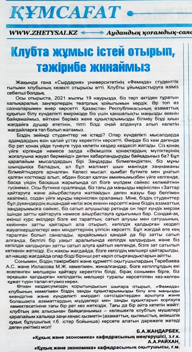Жақында ғана «Сырдария» унивөрситөтінің «Фемида» студенттік ғылыми клубының кезекті отырысы өтті. Клубты ұйымдастыруға өзіміз себепші болдық.