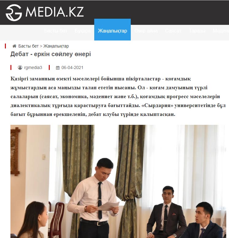 «Сырдария» университетіндегі дебат клубы еркін тұлғалар мен белсенді студенттерді қалыптастыру мен дамытуға бағытталған. Бүгінгі таңда білім беру саласындағы барлық құзыреттілік студенттерге берілгендіктен, кез келген білім алушының қарама-қарсы көзқарастар туындайтын аудиторияны қолдау көрсетілетін позицияға сендіру үшін дәйекті дәлелдерді қолдана отырып, өзін-өзі дамытуға да зор мүмкіндігі бар. Сондай-ақ, оқуда да, мансапта да қандай да бір нәтижеге жету үшін жеке тұлғаның бойында коммуникативтік дағдылар, күйзеліс жағдайына төзімділік пен ұжыммен жұмыс жасай алу қабілеті және басқа да икемдік қасиеттерін дамыту қажеттілігі туындайды. Ал, біздің университетімізде студенттердің тәжірибе жинақтап, өздігінен жұмыс істеуі үшін барлық қолайлы жағдайлар жасалған.