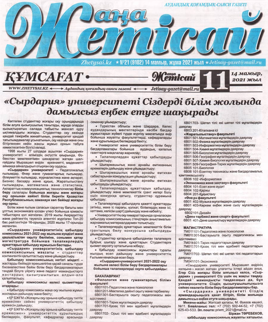 «Сырдария» университетінің қабылдау комиссиясы 2021-2022 оқу жылына күндізгі және қашықтықтан оқыту бөліміне, сонымен қатар магистратура бойынша талапкерлердің құжаттарын қабылдау жұмысын бастады.