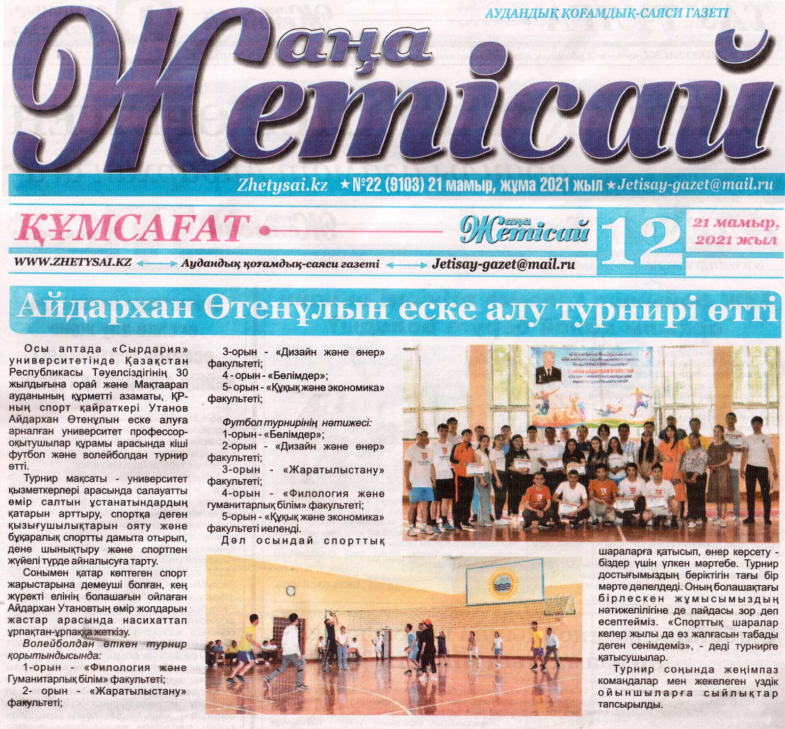 Осы аптада «Сырдария» университетінде Қазақстан Республикасы Тәуелсіздігінің 30 жылдығына орай және Мақтаарал ауданының құрметті азаматы, ҚР-ның спорт қайраткері Утанов Айдархан Өтенұлын еске алуға арналған университет профессор-оқытушылар құрамы арасында кіші футбол жене волейболдан турнир өтті.