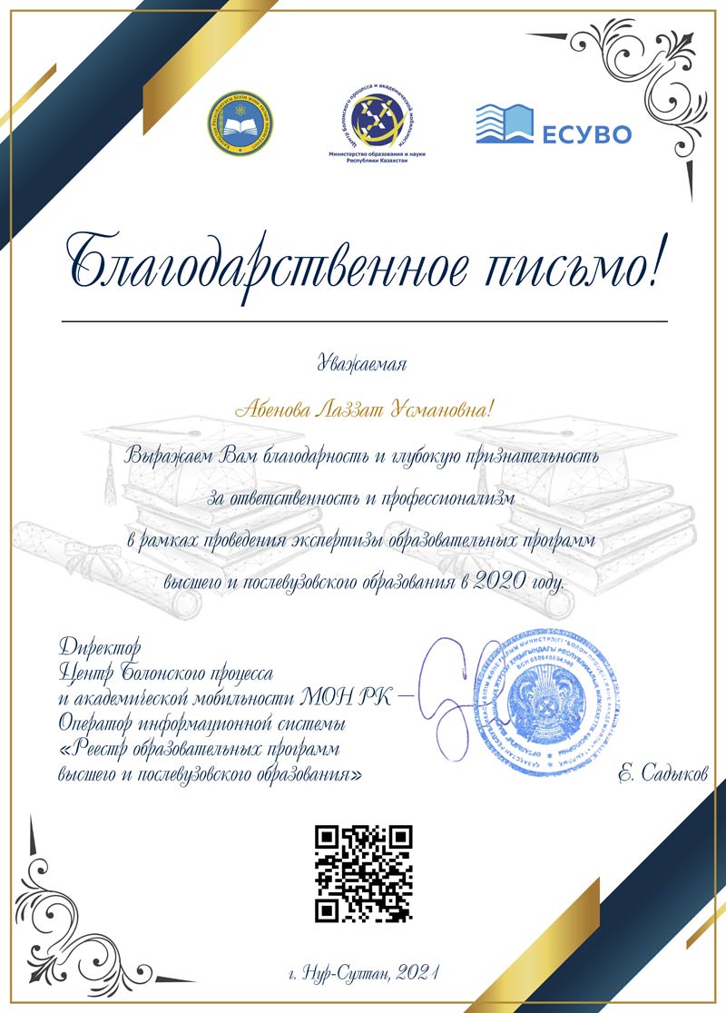 "Сырдария" университеті "Қазақ тілі мен әдебиеті" кафедрасының қауымдастырылған профессор м.а., филология ғылымдарының кандидаты, Ғалым хатшы Абенова Лаззат Усманқызына ҚР БҒМ "Болон процесі және академиялық ұтқырлық орталығы" Сарапшы ретінде Жоғары және жоғары оқу орнынан кейінгі білім беру бағдарламаларының сараптамасын жүргізу кезінде жауапкершілігі мен кәсібилігі үшін Алғыс хат жолдады!