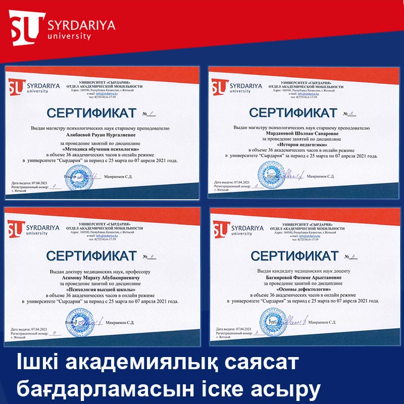 «Сырдария» университеті мен «С.Ж. Асфендияров атындағы Қазақ ұлттық медицина университеті» КеАҚ арасындағы ынтымақтыстық туралы келісім-шарт негізінде келесі профессор-оқытушылар «Сырдария» университетінде» 2021 жылдың 25 наурызы мен 07 сәуір аралығында онлайн форматта дәріс оқып, сертификаттар алды: