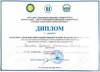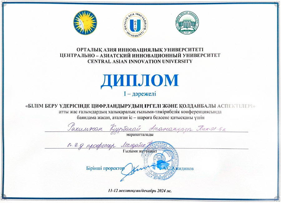 Ж.А.Тәшенев атындағы университеті Педагогика және Жаратылыстану ғылымдар факультеті, «Педагогика және бастауышта оқыту әдістемесі» кафедрасының профессоры Қ.Молдабектің жетекшілігімен Рүстем А.Б. - ПИК 21-5к 1, Рахимжан Қ.А. - ПИК 21-5к 4 топ студенттері, ал профессор Р.И.Кенжебекованың жетекшілігімен Ералы А.Б. - ПИК 21-5к 4 топ студенті «Орталық Азия инновациялық университетінде» «Білім беру үдерісінде цифрландырудың іргелі және қолданбалы аспектілері» атты жас ғалымдардың халықаралық ғылыми-тәжірибелік конфренциясына қатысып пленарлық және Педагогика секциясында баяндама жасап, І-орын иеленді.