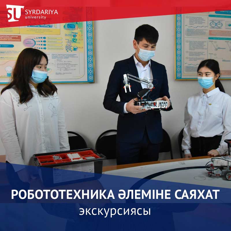 Экскурсия барысында Жетісай ауданының мектеп түлектері, "Бағдарламалық қамтамасыз ету" кафедрасының ғылым магистрі Тастеков Нұрбек Қалдарбекұлы «Робототехника» шеберлік сыныбынан қазіргі заманғы ақпараттық технологиялармен таныстырды.