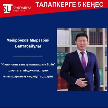 Syrdariya University “Филология және гуманитарлық білім” факультетінің деканы М.Б. Мейірбековтың талапкерлерге арналған 5 кеңесін ұсынамыз.