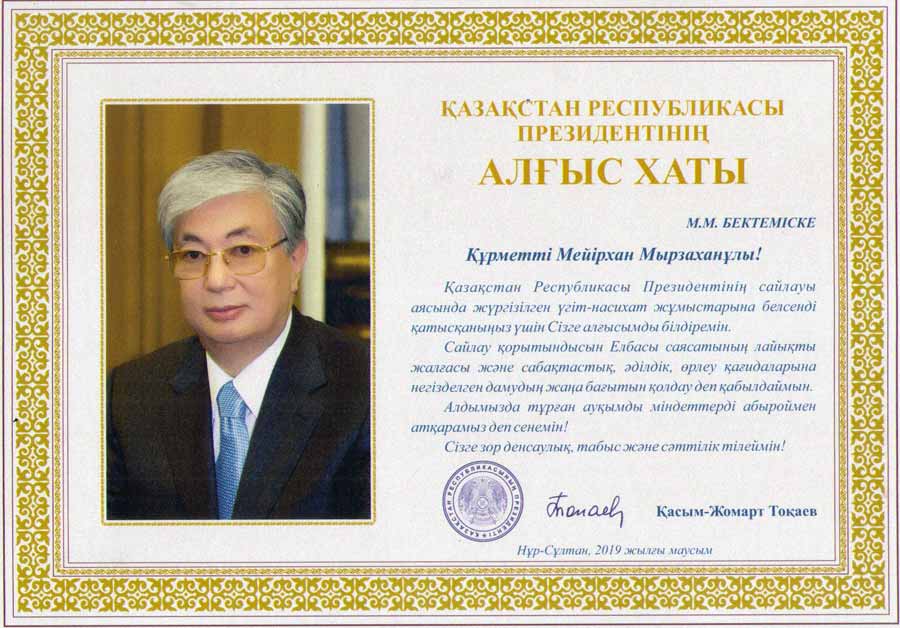 Қазақстан Республикасы Президентінің сайлауы аясында жүргізілген үгіт-насихат жұмыстарына белсенді қатысқаныңыз үшін Сізге алғысымды білдіремін.