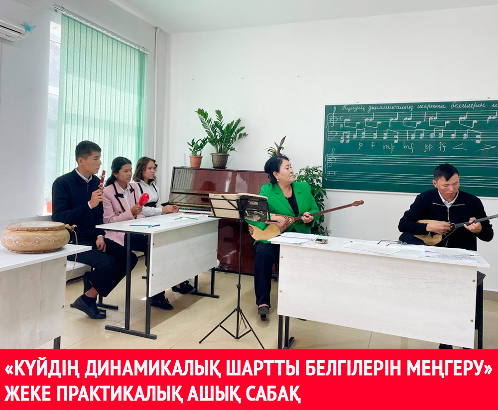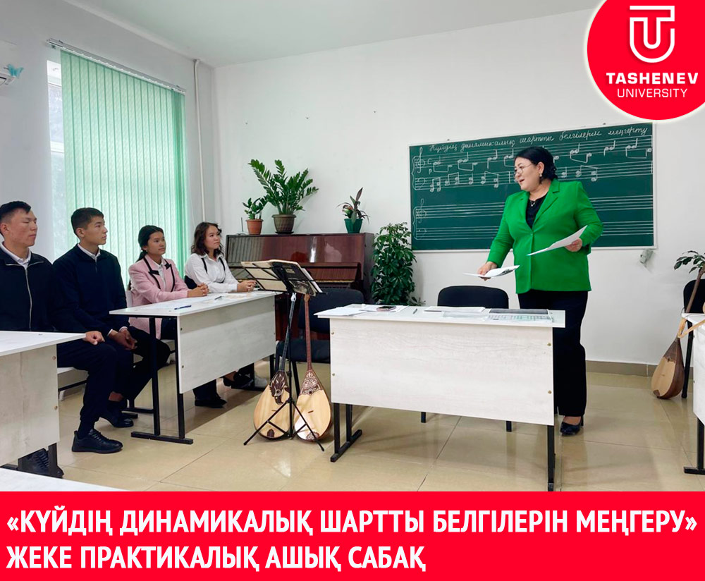 «Ж.А.Тәшенев атындағы университеті»АҚ «Спорт және өнер» факультеті «Саз және ән» кафедрасының ҚР мәдениет қайраткері, магистрант, аға оқытушы Қайнарбаева Айгүл Қалмаханқызының 15.10.2024 күні Гагарин көшесі-22 корпусында ПиК-24-4к 1-курс студенттерімен «Домбыра-І» пәнінен «Күйдің динамикалық шартты белгілерін меңгеру» тақырыбы бойынша жеке практикалық ашық сабақ өткізді. Ашық сабақ өте жоғары деңгейде, талапқа сай жүргізілді.Тақырыпты ашу барысында оқытушы күйдің шығу тарихын аңыз түрінде баяндап, әрбір динамикалық белгілерге ерекше тоқталып, оның күйді тарту барысындағы атқаратын маңыздылығы мен рольін жеке-жеке талдап көрсете білді.Студенттер үшін бұл тақырып өте қызықты әрі түсінікті болды.Сабақ барысында сергіту сәті де қолданылды. Ұлттық аспаптарды да жеке таныстыра отырып, олардың дыбысталу ерекшелітеріне көңіл бөлді. Студенттермен бірге екі дауыста күй ойнап, сол күйдің динамикалық белгілерін күйді тарту барысында нақты көрсетіп түсіндіре білді. Студенттерге таныс емес күйді тыңдатып, сол күйді қағаз бетіне суреттеу арқылы күйге тақырып қою тапсырмасы берілді. Сабақ өте тартымды әрі қызықты өтті.