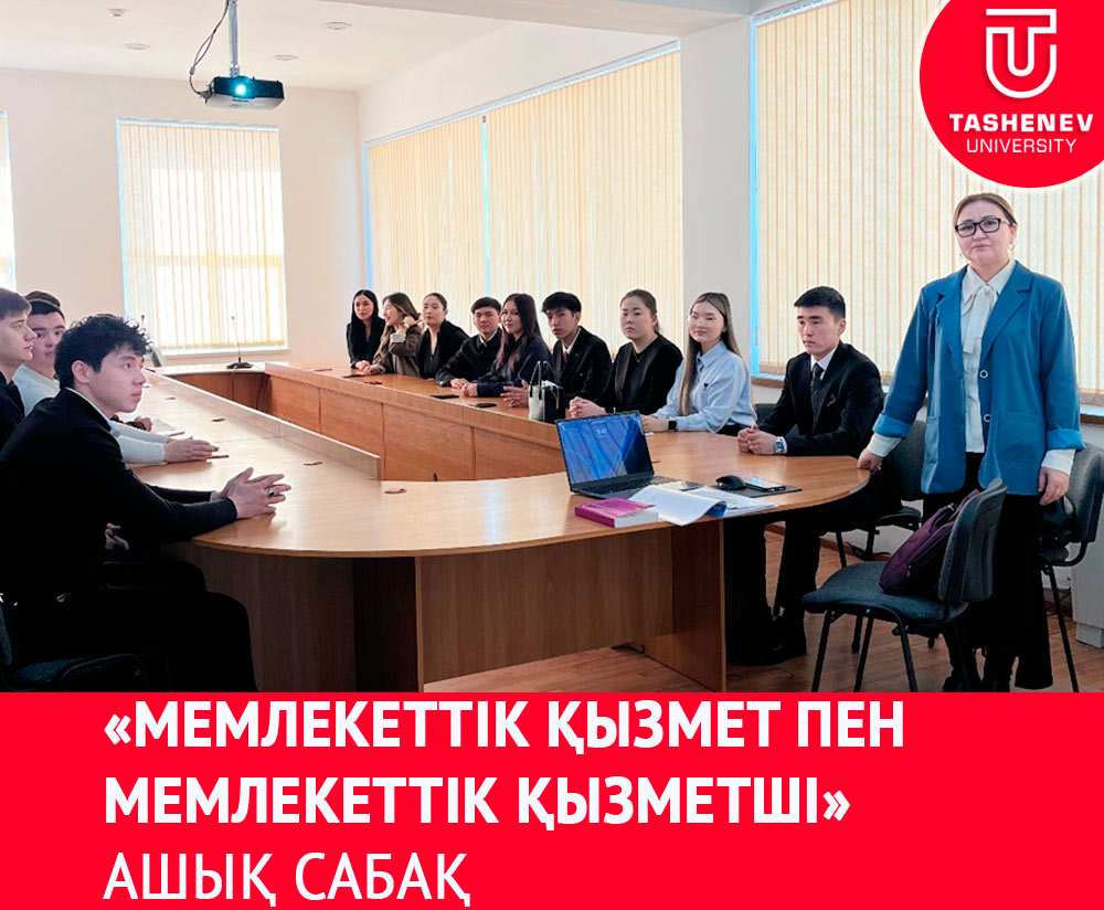 Жұмабек Ахметұлы Тәшенев атындағы университеттің 2025 жылдың 18 ақпанында М.Т. Сатыбалдиеваның 6В04201-Құқықтану БББ 3 курс, ИЭФ-5к1-6 тобы білім алушылары арасында «Қазақстан Республикасының әкімшілік құқығы» пәнінен «Мемлекеттік қызмет пен мемлекеттік қызметші» тақырыбы бойынша жоспардан тыс ашық сабақ (қонақ лекция) өтілді. Ашық сабаққа Б.Момышұлы орталығының арнайы пәндер циклінің бастығы з.ғ.к. полковник Қаратаев Тұрдалы Жақсылықұлы, Қазақстан Республикасы Мемлекеттік қызмет істері агенттігінің Шымкент қаласы бойынша Департаментінің бас маманы Альжанова Жазира Салхановнаның қатысуымен өткізілді.