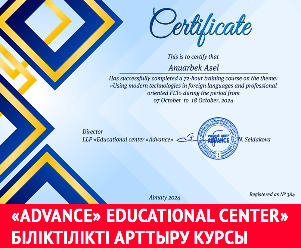 2024 жылы 16 қыркүйектен 18 қазан аралығында Жумабек Ахметұлы Ташенев атындағы университеттің профессор-оқытушылар құрамы Алматы қаласында 72 сағат көлемінде оқылатын пәндер бойынша «Educational Center «Advance» біліктілікті арттыру курсынан өтті. Курс «Шетел тілі: екі шет тілі» білім беру бағдарламасының пәндері бойынша коммуникативті дағдыларды дамытуға бағытталған.
