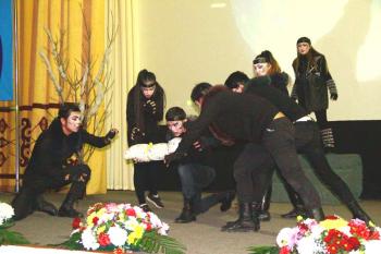 Шер ағаның туындысын драмалаған автор – Айжан қыз, қоюшы режиссер – Айтибаев Қажыбай, театрды ұйымдастырушы – Абенова Ләззат, көмекшісі – Ермекбай Ермахан. Қойылымдағы рольдерді орындағандар: Құртқа – Мұса Назерке, Ақберен – Анарбек Ұлжалғас, Аңшылар – Даниярұлы Абылай, Икрам Марат, Ана – Айдар Баян, Қасқырлар – Ермекбай Ермахан, Есенбек Еркеғали, Әлібек Нұрдәлет, Ахметов Ибрагим, Шәріпбай Әйгерім, Жұмабек Ұлжан.