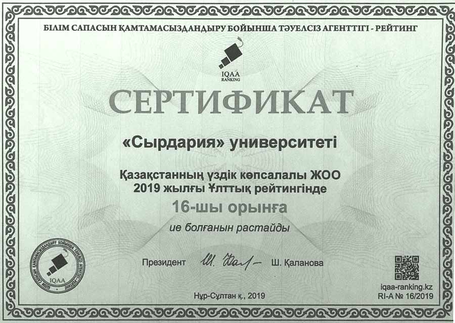 Білім сапасын қамсыздандыру бойынша тәуелсіз агенттігі жүргізген Қазақстанның үздік көпсалалы ЖОО 2019 жылғы Ұлттық рейтингінде "Сырдария" университеті он алтыншы орынға табан тіреді.