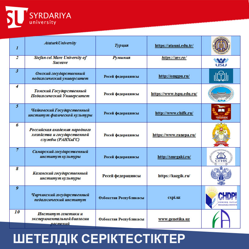 2020-2021 оқу жылында «Сырдария» университеті алыс және жақын шетелдік жоғары оқу орындарымен халықаралық ынтымақтастық жөніндегі меморандумдарға қол қойды.