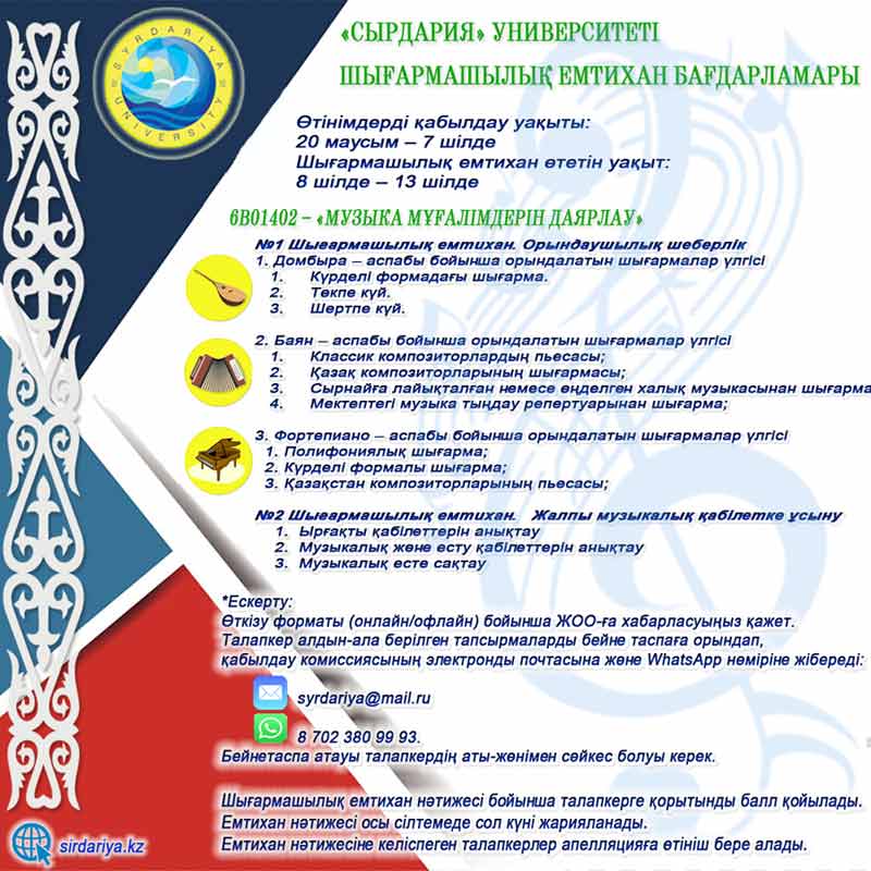 *Ескерту: Өткізу форматы (онлайн/офлайн) бойынша ЖОО-ға хабарласуыңыз қажет. Талапкер алдын-ала берілген тапсырмаларды бейне таспаға орындап, қабылдау комиссиясының электронды почтасына және WhatsApp нөміріне жібереді: syrdariya@mail.ru., 8 702 380 99 93. Бейнетаспа атауы талапкердің аты-жөнімен сәйкес болуы керек.