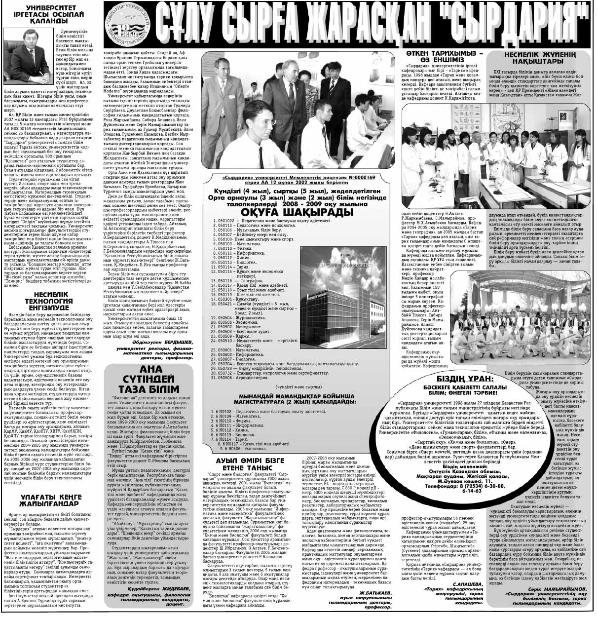 Ал, ҚР Білім және ғылым министрлігінің 2007 жылғы 12 қаңтардағы №18 бұйрығымен тағы да 5 жылға мемлекеттік жіктеуші және АА №0000169 мемлекеттік лицензиясына сәйкес 26 бакалавриант, 9 магистратура мамандықтары бойынша кадр даярлап отырған "Сырдария" университеті осындай білім ошағы! Тарата айтсақ, университеттің колдың бес саулағындай бес оку ғимараты, әкімшілік орталығы, 500 орындык "Қазақстан" деп аталатын студенттер сарайы, ғылыми-әдістемелік орталығы бар. Оған виртуалды кітапхана, 2 абоненттік кітапхананы, жалпы және оқу залдарын қосыңыз.