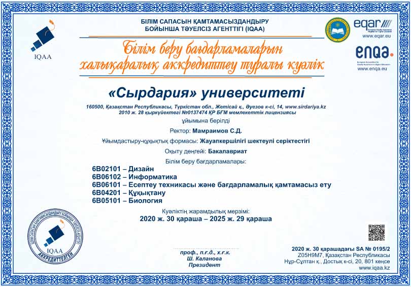 Аудит қорытындысы бойынша «Сырдария» университетінің 19 Білім беру бағдарламаларын халықаралық аккредиттеу туралы куәлік берілді.