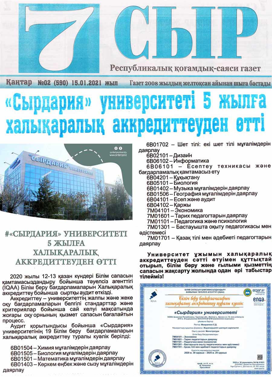 Аудит қорытындысы бойынша «Сырдария» университетінің 19 Білім беру бағдарламаларын халықаралық аккредиттеу туралы куәлік берілді: