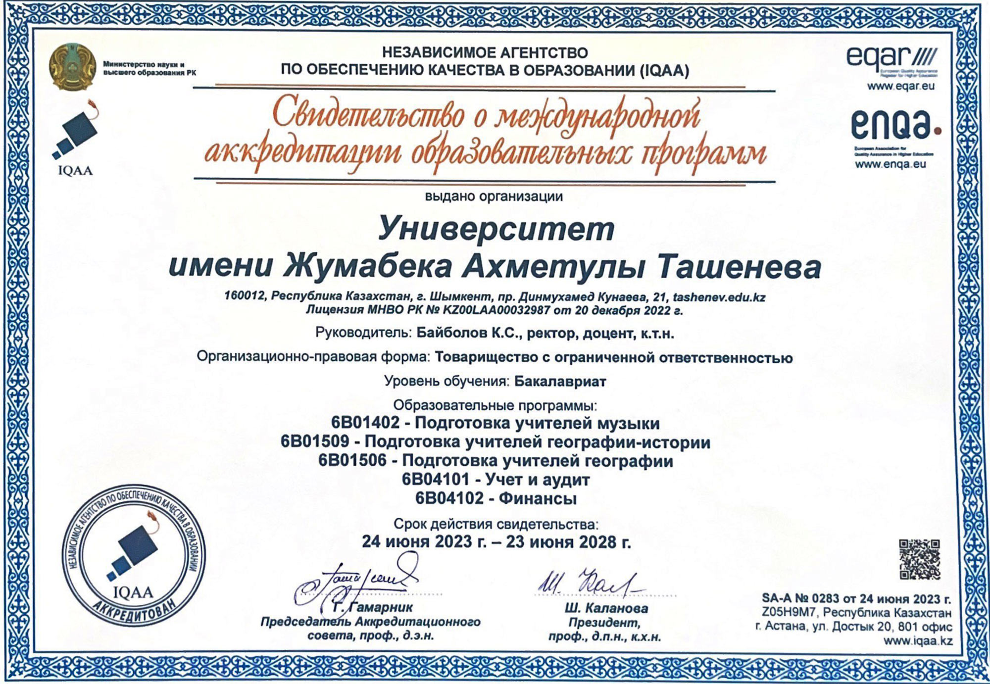 ► 22.06.2023. Свидетельство о специализированной международной аккредитации (6В04103 - Экономика). Срок действия: 22.06.2028