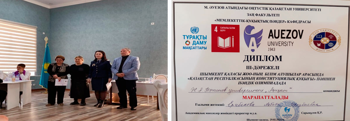 24 апреля 2024 г. в Южно-Казахстанском Университете имени М.Ауезова была  проведена предметная олимпиада  по дисциплине  «Конституционное право РК» среди студентов высших учебных заведений, где команда «Акикат» получили 3-е призовое место.