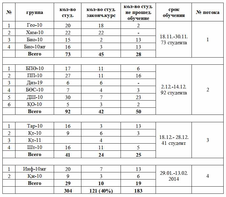 Ниже в таблице показаны общие сведения о проведенных курсах среди студентов.
