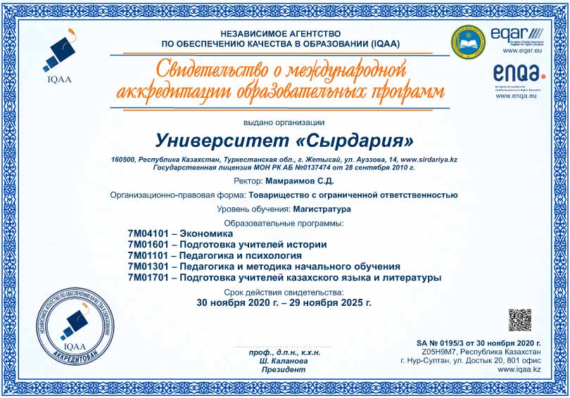 По итогам аудита выдано свидетельство о международной аккредитации 19 образовательных программ университета "Сырдария".